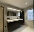 Moderne badkamer met een strakke, minimalistische afwerking. Lichte tegels zorgen voor een ruimtelijk gevoel, gecombineerd met een inloopdouche in donker getint glas en zwarte accenten. Het zwevende badmeubel met witte wastafel en verlichte spiegel geeft de ruimte een luxueuze en eigentijdse uitstraling.
